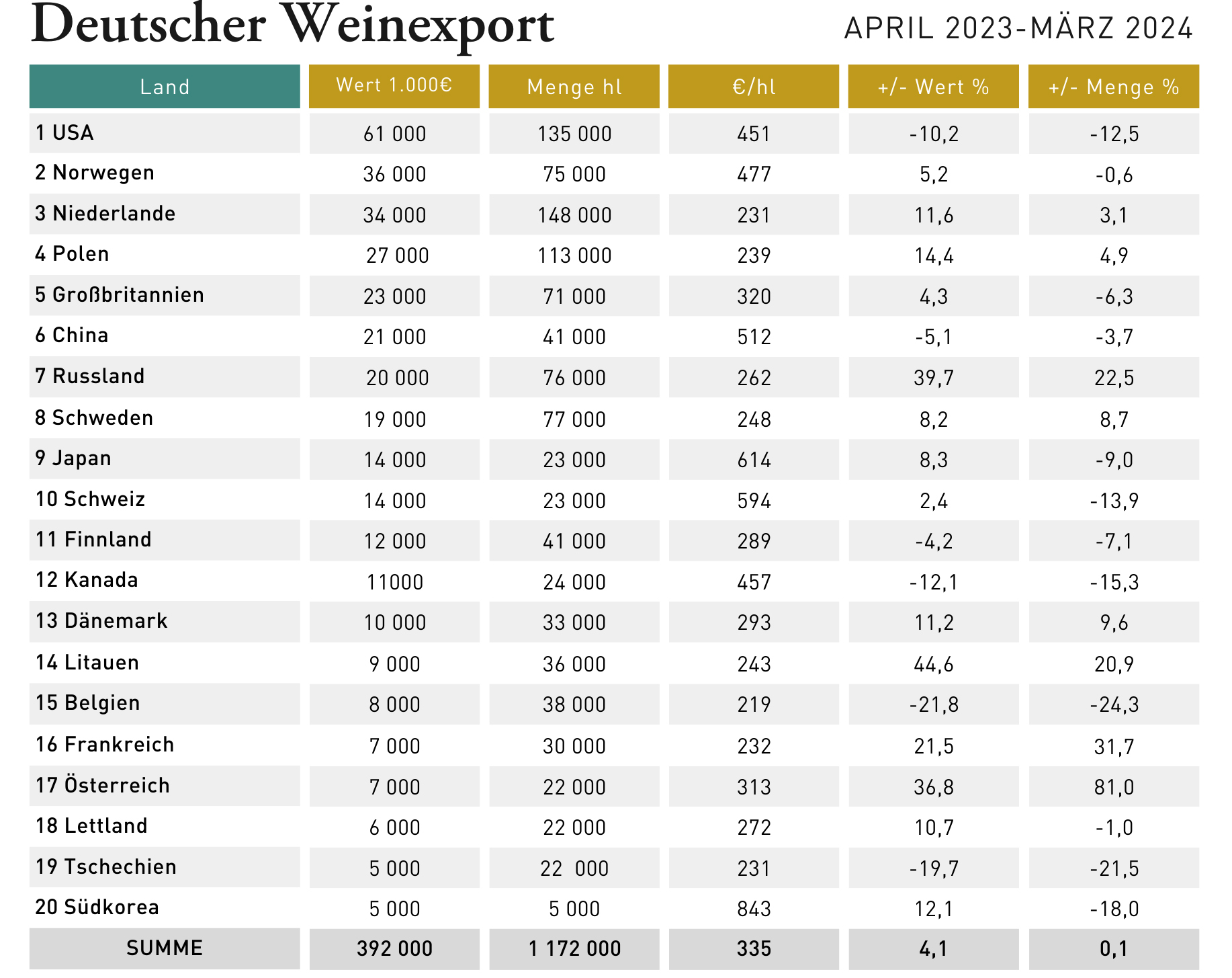 For the two-month period from April 2023 to March 2024, exports of German wines totalled 1.17 million hectolitres with a value of 392 million euros, which represents an increase in value of 4.1 per cent compared to the same period in the previous year, with volumes remaining stable. The average price that producers paid for a litre of wine abroad during this period was 3.35 euros, 13 cents higher than in the same period last year.
