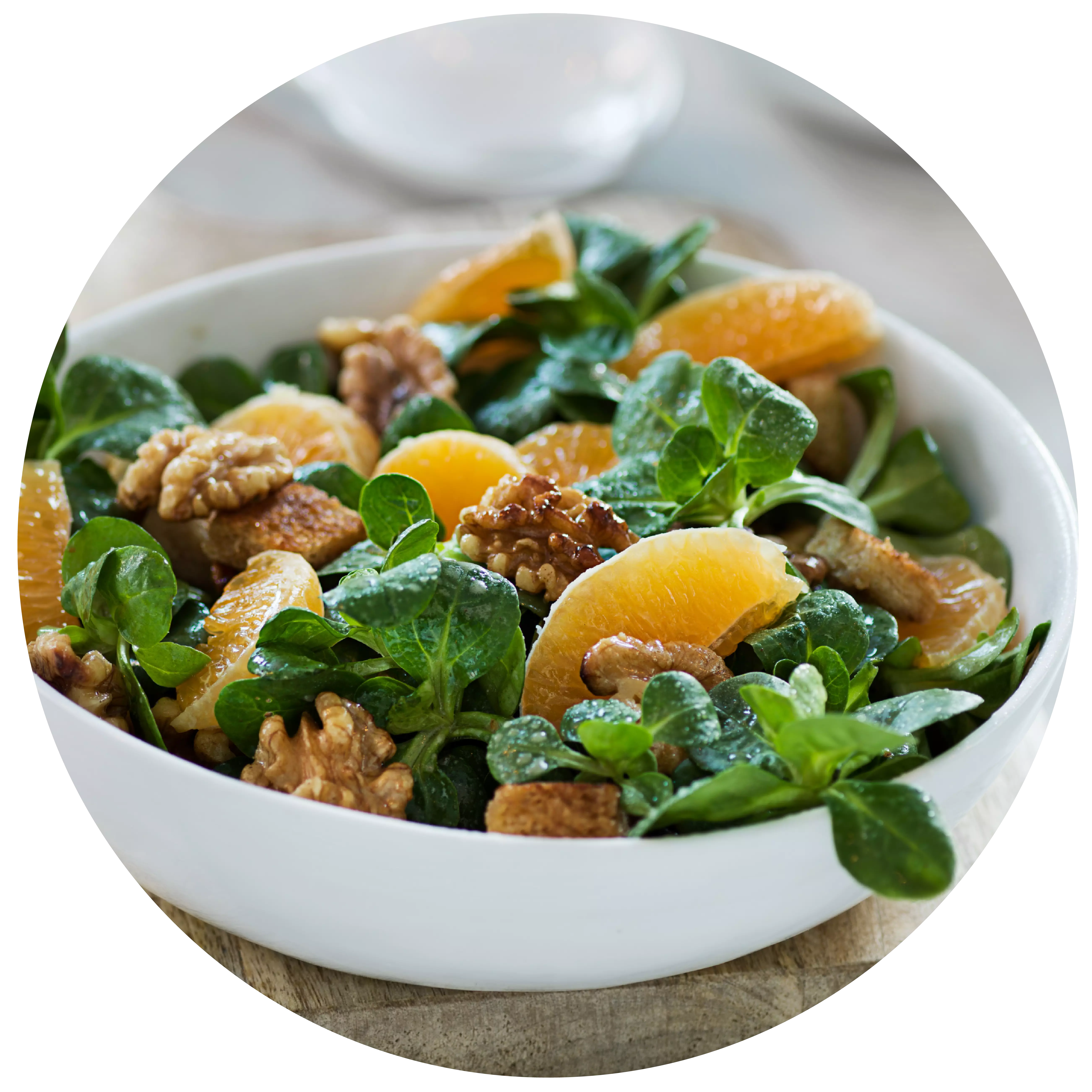 Arrange the lamb's lettuce on a plate, add the marinated clementines and scatter the walnuts and croutons on top.