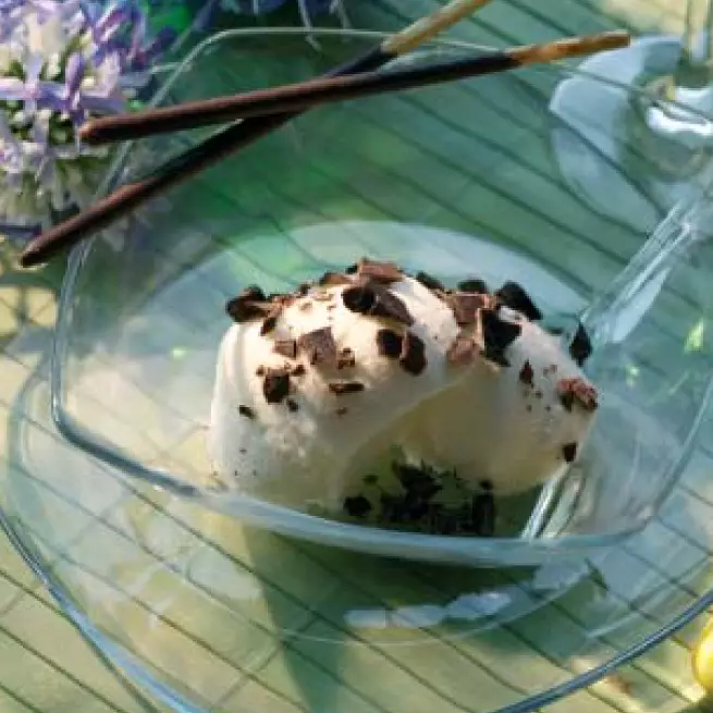 5. cut out dots from the cream with a spoon, arrange on a plate or in a glass and decorate with the chocolate.
