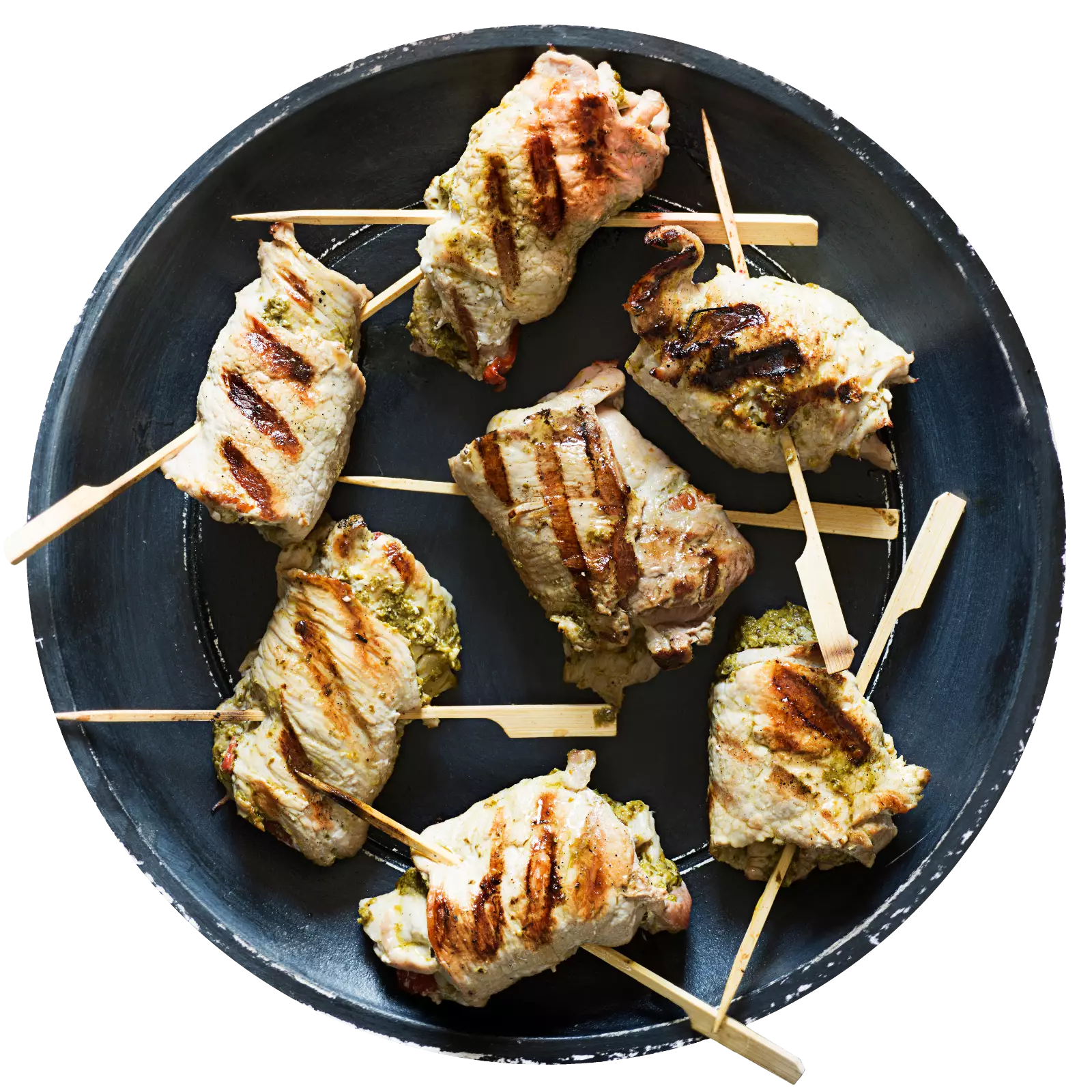 Spread the pecorino over the paprika. Roll up the meat from the coated side and pin in place with wooden skewers. Grill the escalope rolls on the barbecue for 20-25 minutes, turning if possible, and indirectly for the last 10 minutes.